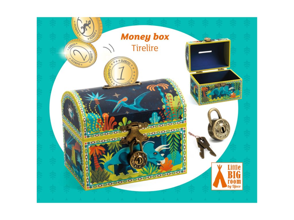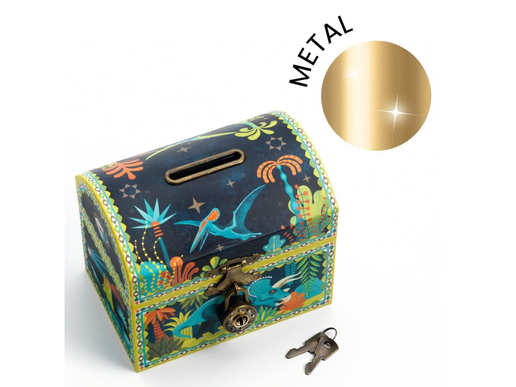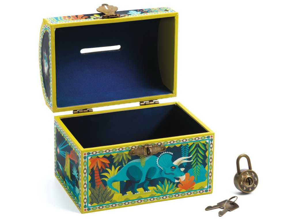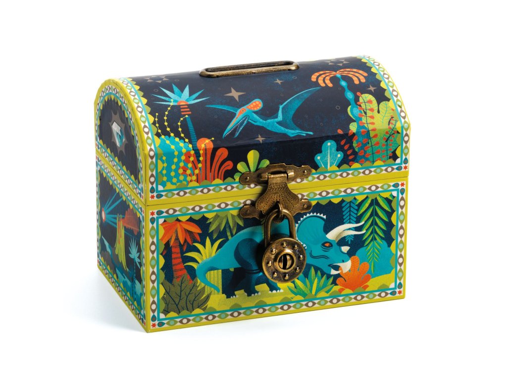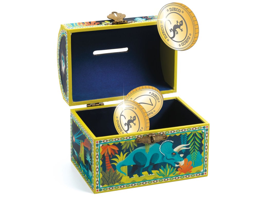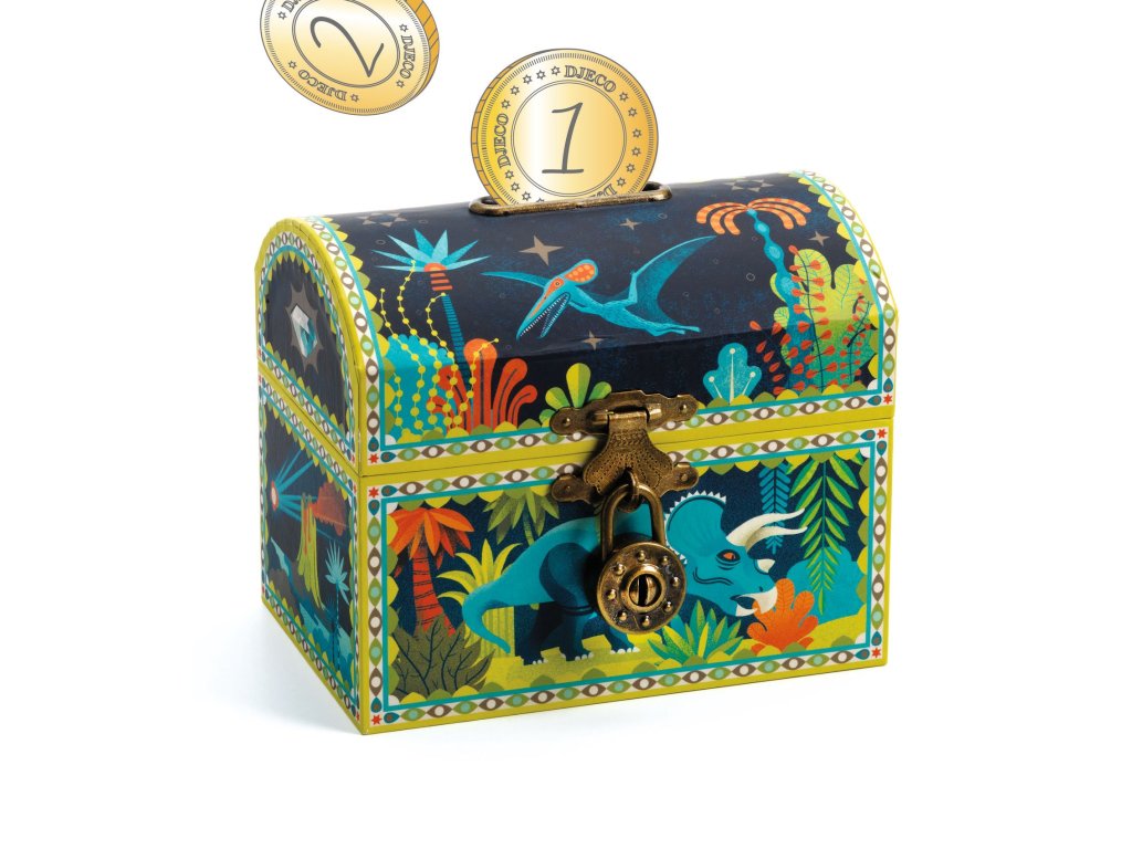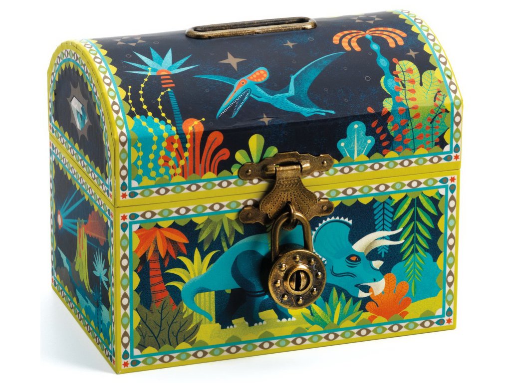 Pokladnička - Dinosaurus od firmy Djeco je kasička na peníze a truhla na poklady. Je zdobená malovanými dinosaury a bude skvělá na šetření prvních peněz i na uschování jiných pokladů.