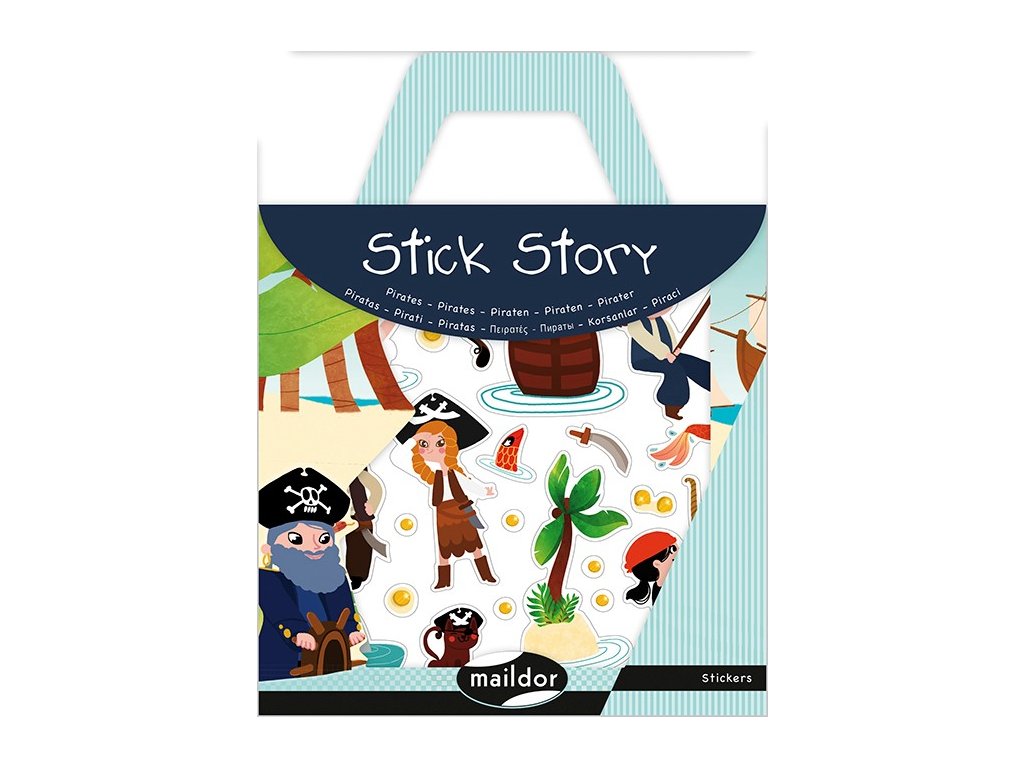 Příběhový sešit se samolepkami Piráti od firmy Maildor je pevná rozkládací scenérie se spoustou přemístitelných samolepek, ze kterých lze opakovaně tvořit nové a jiné příběhy. Základem pro lepení samolepek je pirátský ostrov a pirátská loď.