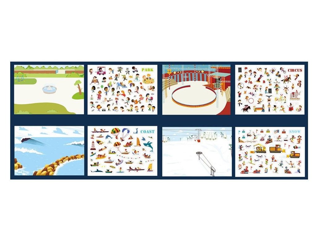 Nalepování samolepek znovu a znovu. Přemístitelné samolepky mohou děti lepit opakovaně a vytvářet každý den nové příběhy. A to hned na 4 různé scenérie.