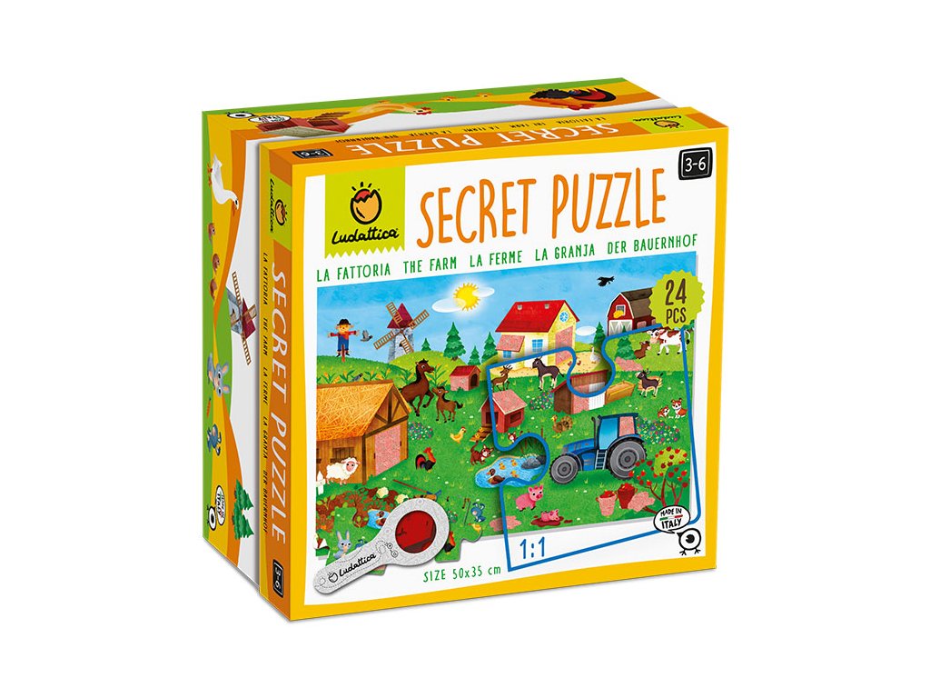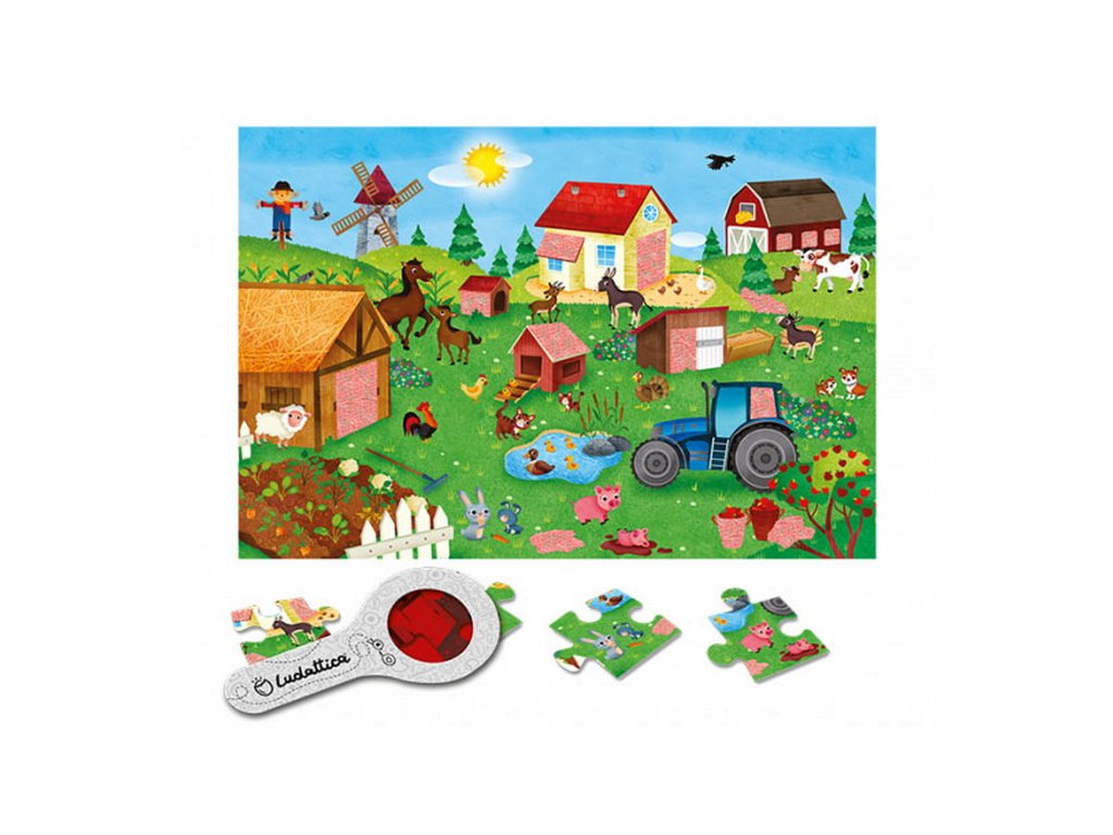 24 velkých dílků originálního puzzle od firmy Ludattica, ze kterých sestavíte farmu. Objevíte, kdo zde žije a jak se baví. Ale nejen to. Máte možnost ji podrobněji prozkoumat pomocí přiložené kouzelné lupy. A zjistíte nejedno tajemství.