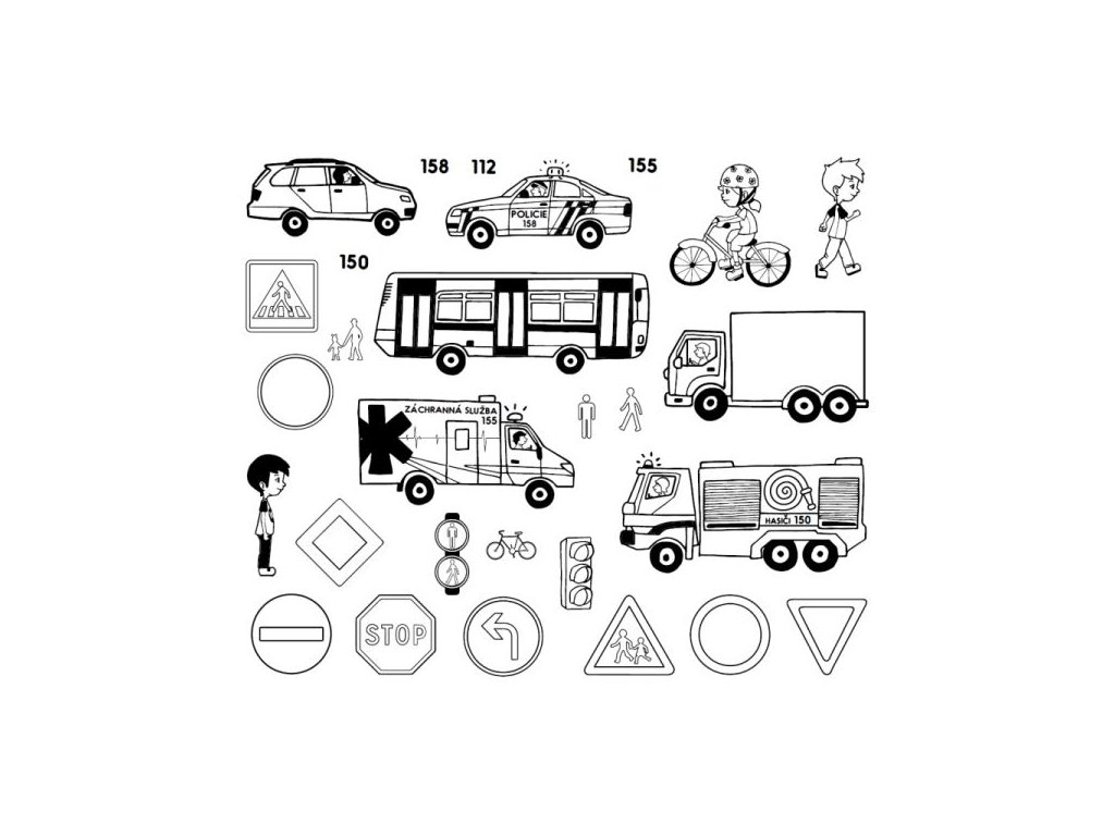 Razítka StampoMinos Dopravní prostředky je 28 velkých razítek vhodných k domalování či vybarvení. Vytvoř si jednoduše krásný obrázek plný sanitek, hasičů, policistů, autobusů, aut, chodců i kol a také samozřejmě dopravních značek.