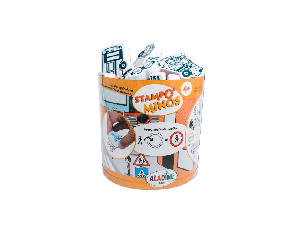 Francouzská firma AladinE vznikla v roce 1985. Původně se zaměřovala na psací potřeby a voskové pečeti. Postupně využila rostoucího zájmu o tzv. scrapbooking a vytvořila první řadu originálních gumových razítek. V roce 2004 se díky svým inovacím a uvedením kreativních setů stala významným evropským výrobcem dekorativních razítek se zaměřením na svatební razítka a razítka k narození dítěte. A to už byl jenom krůček k řadě razítek pro děti. V roce 2008 AladinE poprvé uvedla na trh velká dětská razítka pod názvem StampoMinos. Je to kolekce hravých velkých obrázků vytvořených k tomu, aby děti inspirovaly k tvoření a rozvoji fantazie. Postupně se nabídka razítek rozšířila také o velká razítka pro batolata StampoBaby i malinká razítka pro starší děti.