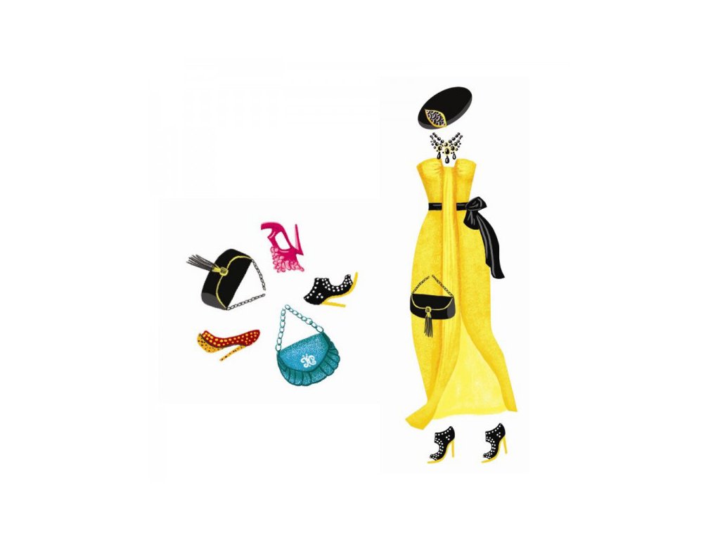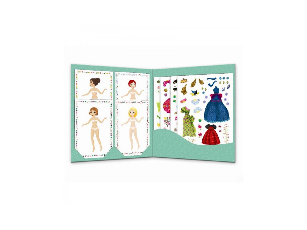 Balení obsahuje 4 "modelky" a 4 plata samolepek šatů a módních doplňků.