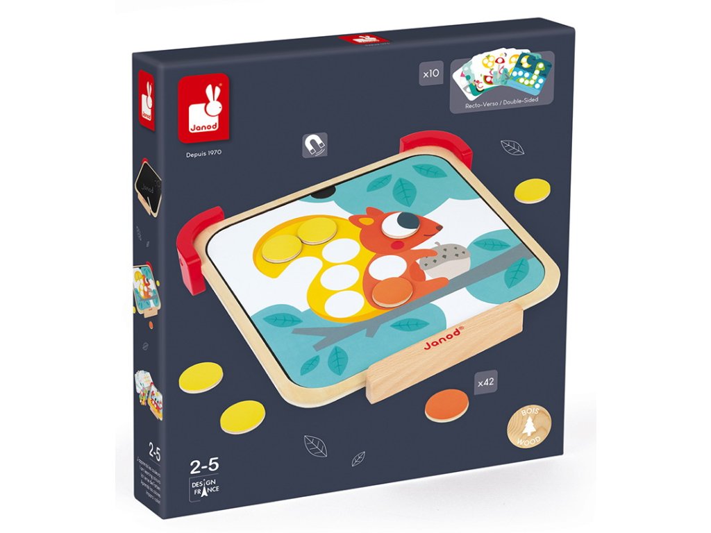 V balení deti nájdu drevenú magnetickú základnú dosku o veľkosti 29x29 cm. Na tú si postupne umiestňujú 20 základných obrázkov, ktoré dopĺňajú farebnými žetónmi podľa zadania. Deti sa tak ľahko naučia farby a zabavia sa. Magnetická tabuľka je v čiernej farbe a je možné ju používať aj na maľovanie kriedou.