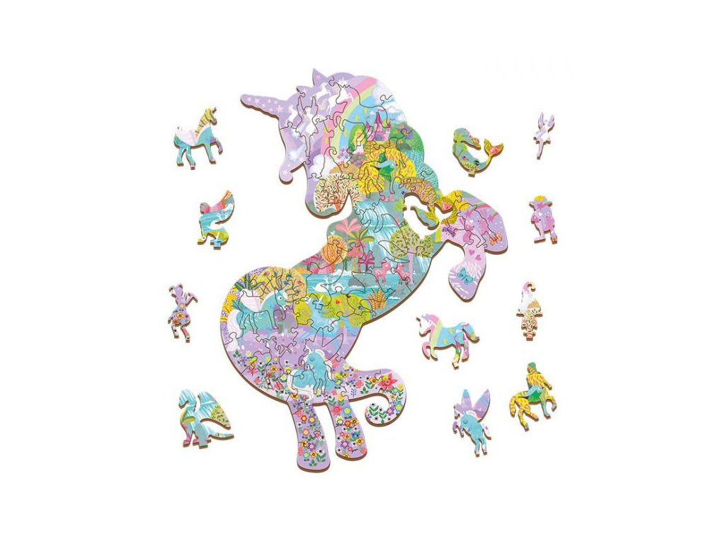 Originálne drevené puzzle Jednorožce od firmy Ludattica, z ktorých zostavíte obrázok kúzelného jednorožca, v ktorom sa ukrýva množstvo rozprávkových bytostí.