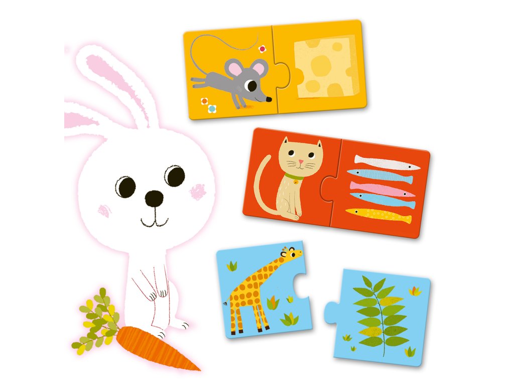 Duo puzzle Čo bude dnes na obed Djeco sú párové puzzle pre najmenšie deti. Čo ktoré zvieratko jej? Nájdite zvieratkám ich potravu.