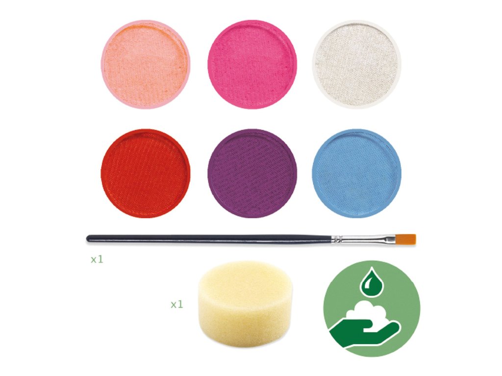 Farby na tvár Djeco sú zdravotne nezávadné, neobsahujú parabény ani parfumy, sú ľahko odstrániteľné vodou a mydlom.