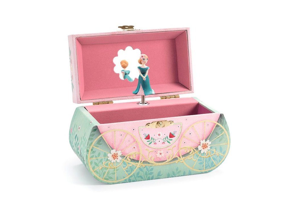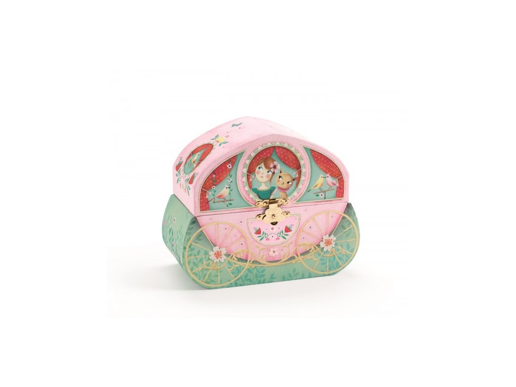 Hracia šperkovnica v tvare koča s tancujúcou princeznou od firmy Djeco. Čo všetko ukrýva za poklady? Veľké poklady malých slečien! Dievčatká si do nej môžu uschovať sponky, prstienky, retiazky i korálky. Šperkovnica po otvorení hrá príjemnú melódiu a princezná pritom tancuje.