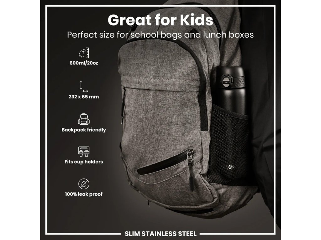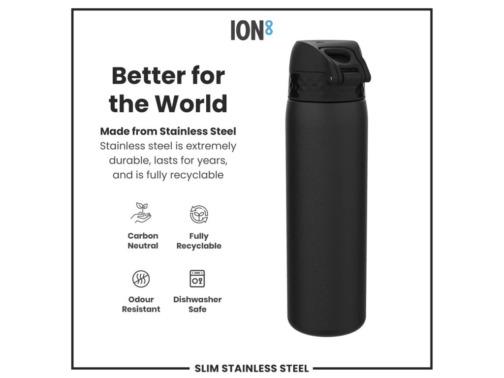 Nerezová fľaša na pitie Leak Proof Black 600 ml ml od firmy ion8 je praktická fľaša, ktorú užijú deti aj dospelí. Hodí sa do školy, na šport aj na cestovanie.