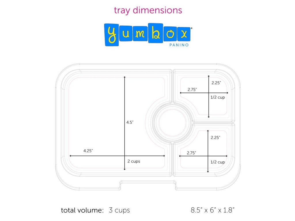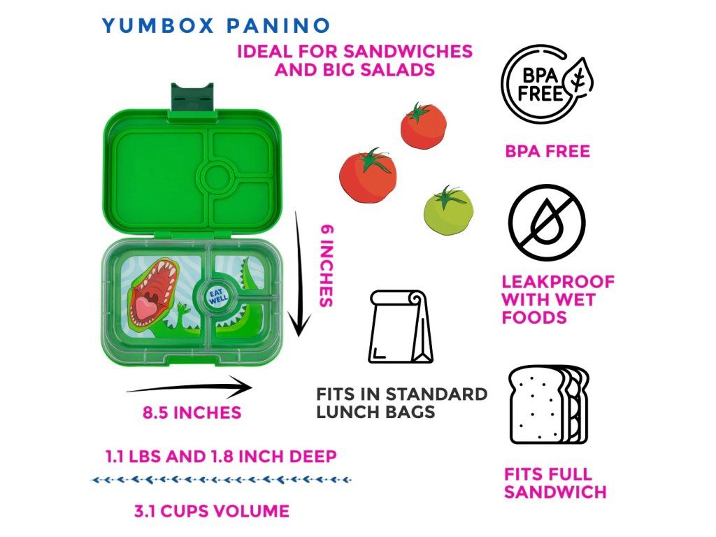 Zábavné a praktické krabičky Yumbox Panino sú rozdelené na 3 priehradky. Väčšia priehradka na sendvič a iné pečivo a 2 menšie priehradky na zeleninu, ovocie či sušienky. Súčasťou krabičky je aj miesto na dip, oriešky alebo nejakú sladkosť.