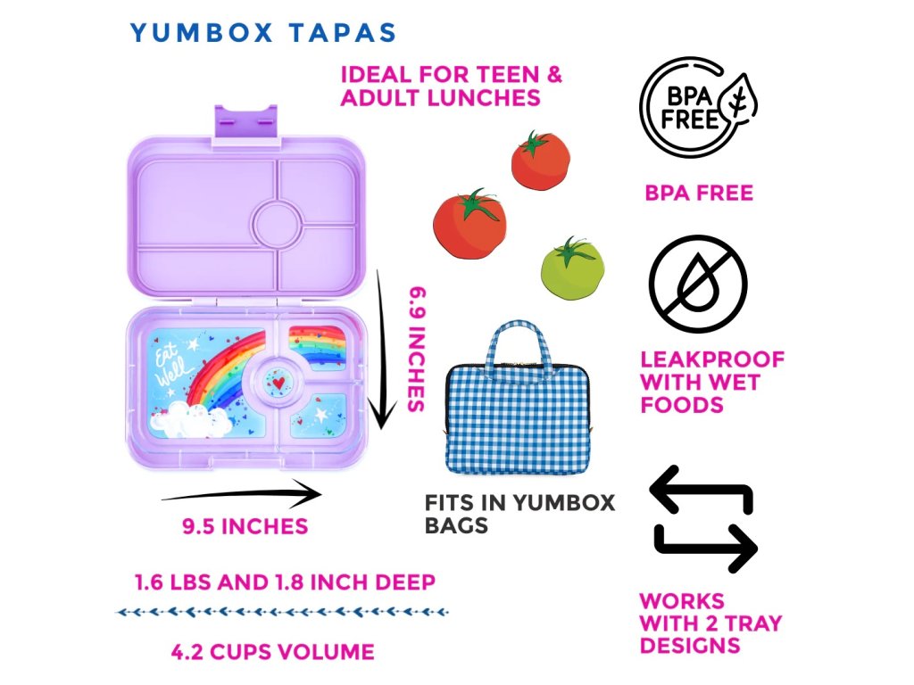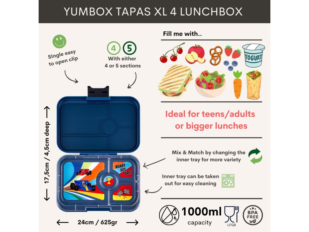 Zábavné a praktické krabičky Yumbox XL Tapas sú rozdelené na 4 priehradky. Väčšia priehradka na sendvič a iné pečivo, 2 menšie priehradky na zeleninu, ovocie či sušienky a 1 menšia na dip či sladkosti.