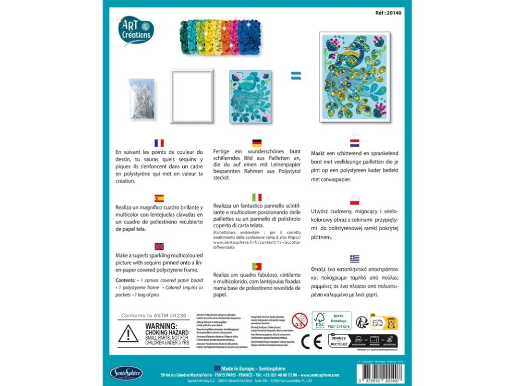Balenie obsahuje: 1 polystyrénový rám, 1 tlačená ilustrácia s motívom páva, 6 balení farebných flitrov, balenie špenlíkov na prichytávanie a návod na použitie.