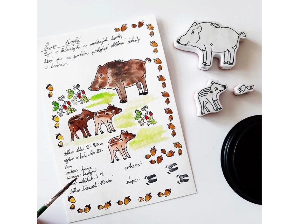 V balení Lesné zvieratká nájdete 28 pečiatok zvierat, ich stôp a ich potravy, ktorou sa živia. Deti si môžu pomocou týchto pečiatok vytvoriť krásne obrázky aj priania. Předmalují si les či lúku, pečiatkami vytvorí obrázky zvieratiek, ktoré následne vymaľujú. Obrázky je možné dozdobiť podľa vlastnej fantázie. Môžu tak vzniknúť krásna umelecké dielka najmenších deti, ale aj tých veľkých.