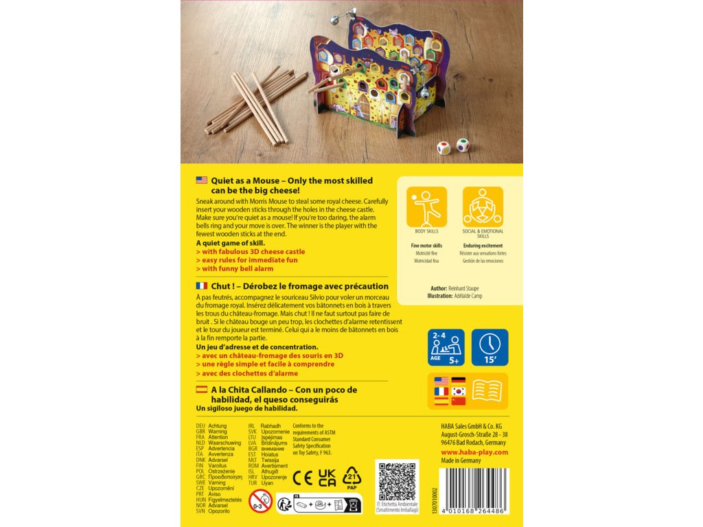 Spoločenská hra Ticho ako myšky od firmy Haba je zábavná hra pre malých aj väčších hráčov. Dokážete umiestniť tyčinky do hradu podľa farieb tak, aby sa neozvala rolnička?