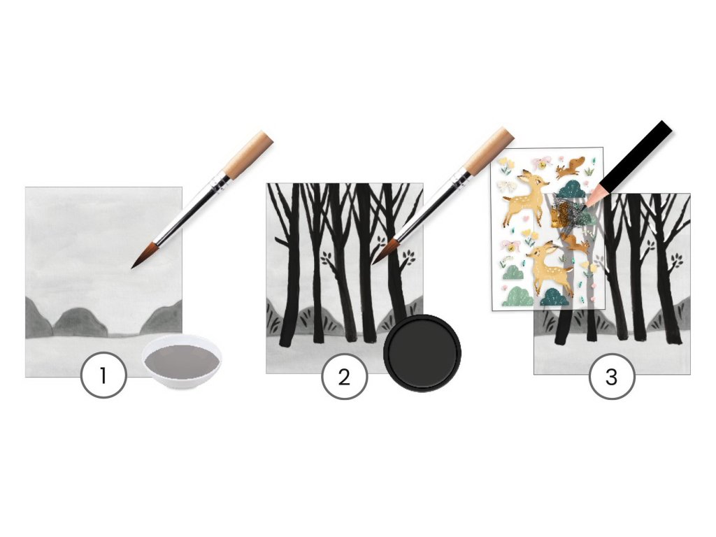 Deti postupne miešajú na obrazy rôzne odtiene čiernej a šedej farby. Túto techniku vymývania atramentom aplikujú pomocou štetcov, ktorými vytvárajú krajiny. Tie následne doplnia farebnými propisotami zvieratiek a ďalších doplnkov.