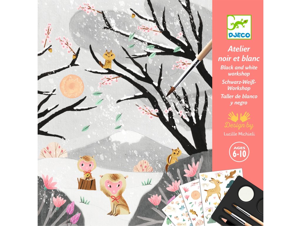 Kúzelná výtvarná sada Djeco Posledný sneh ponúkne deťom kreatívnu zábavu s miešaním odtieňov čiernej a šedej a nanášanie propisotov pri maľovaní snehových obrazov.