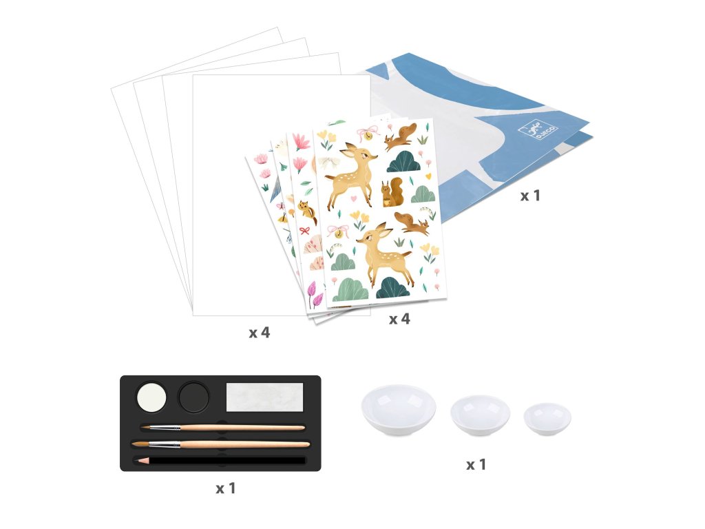 Sada obsahuje 4x2 základné obrazy pripravené na vymaľovanie (15x20 cm), 4 archy propisotov, 3 kelímky, 1 sadu farieb, 2 štetce, ceruzku a špongiu, obrus na maľovanie a návod krok za krokom k postupnému maľovaniu