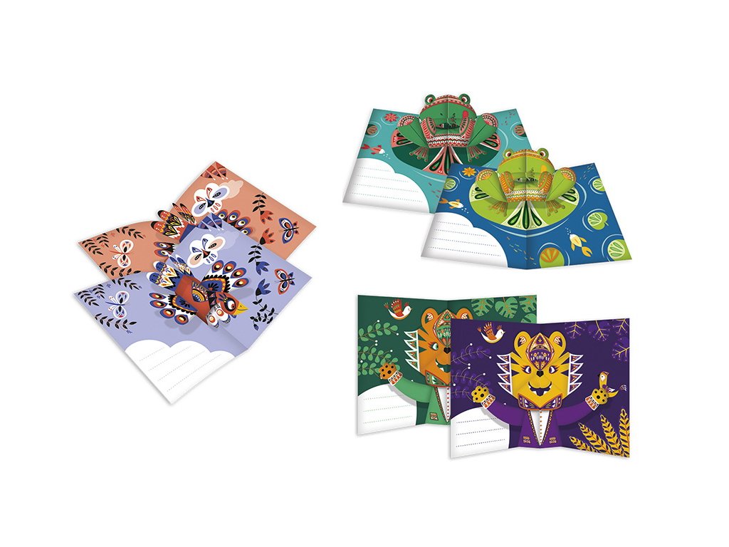 Deti si postupne vytvoria 6 kariet so zvieratkami. Základ priania či obrázku dozdobí pomocou priložených samolepiek. V ďalšom kroku poskladajú origami z pevných častí. Z tých vytvorí 3D zvieratko, ktoré vyskakuje z obrázku. Nalepí ho na predlohu. A potom už len stačí napísať prianie, pozvánku, venovanie alebo odkaz.