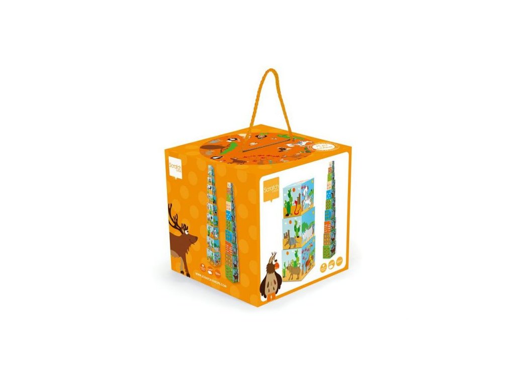 Edukativní pyramida Scratch ZOO ukrývá mnoho možností stavění a skládání. Kostky mohou být stavěny jedna na druhou do výšky nebo vedle sebe jako puzzle.
