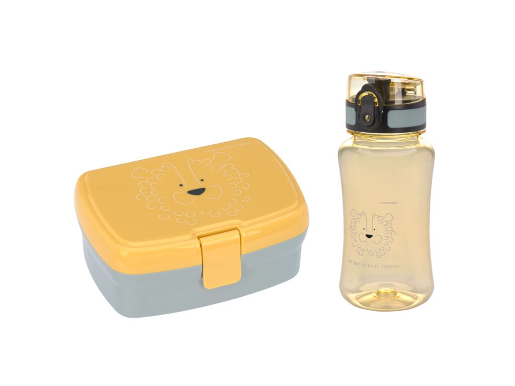 Svačinový set - krabička a láhev About Friends Lion Lässig je praktická dělená krabička na svačinu a láhev na pití pro děti.