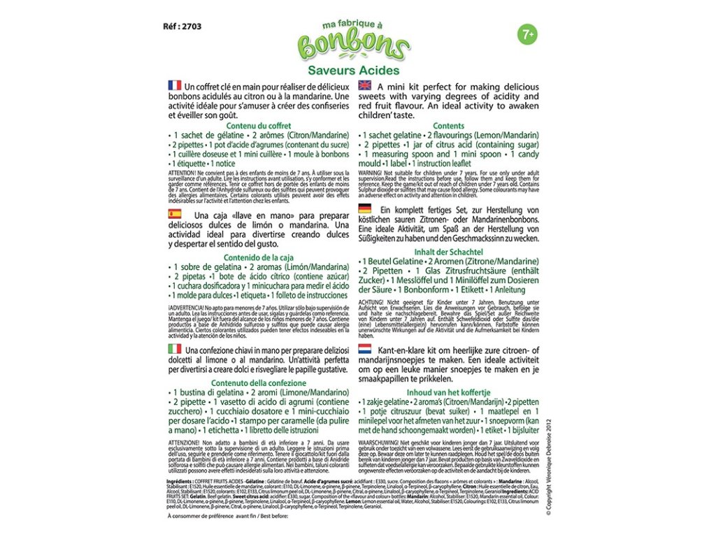 Balení obsahuje: 1 sáček, 2 příchutě (mandarinka, citron), 2 pipety, kyselina citronová, odměrná lžíce, špachtle, míchací nádoba, forma na bonbony. Není součástí a bude potřeba - cukr a voda.
