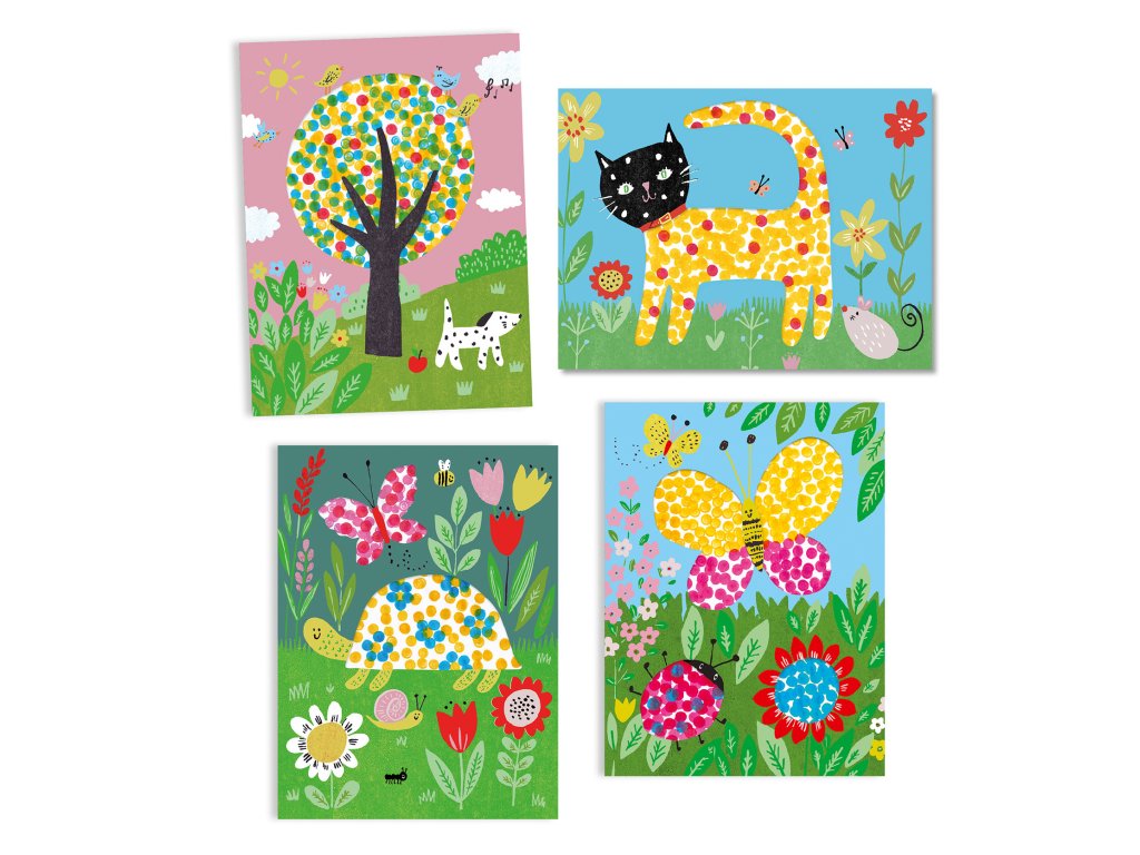 Kreativní sada obsahuje speciální barvičky, kterými děti vytvářejí obrázky pomocí tečkování nebo malování prsty.