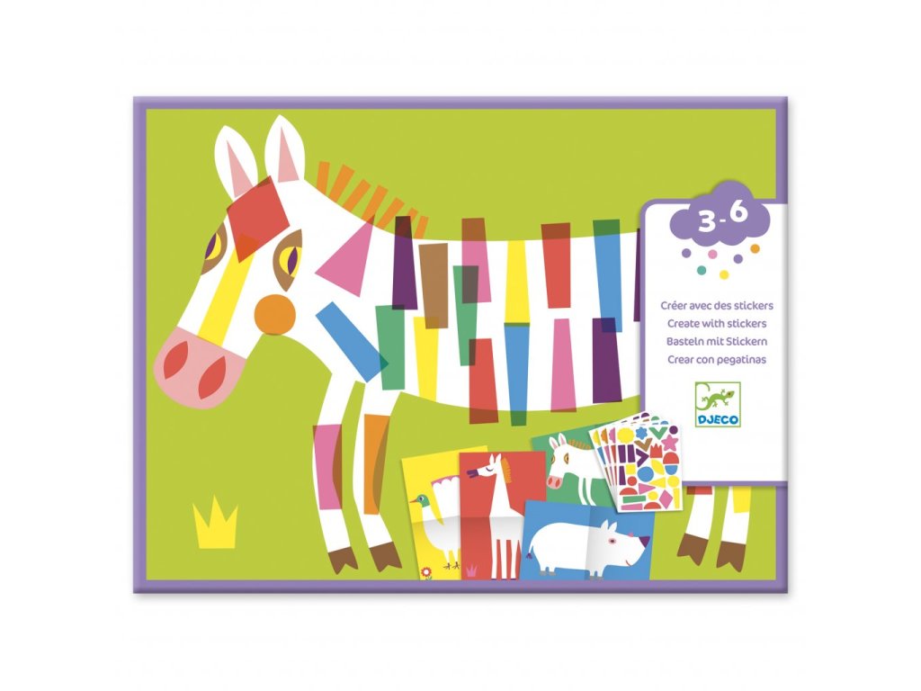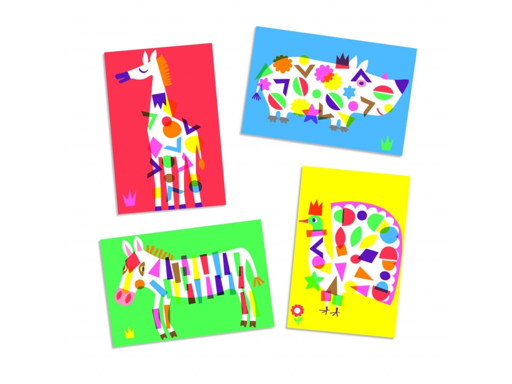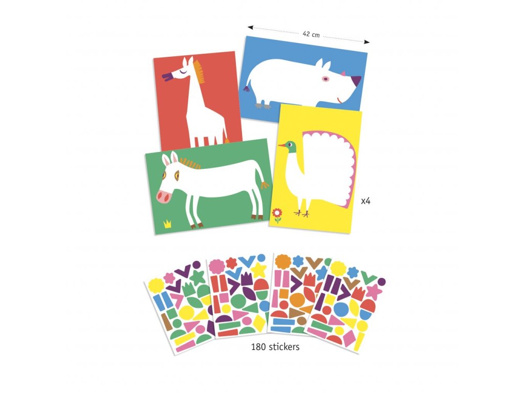 Výtvarná sada se samolepkami Barevné tvary od firmy Djeco jsou pevné obrázky s velkými zvířátky, které si děti dozdobí podle své fantazie.