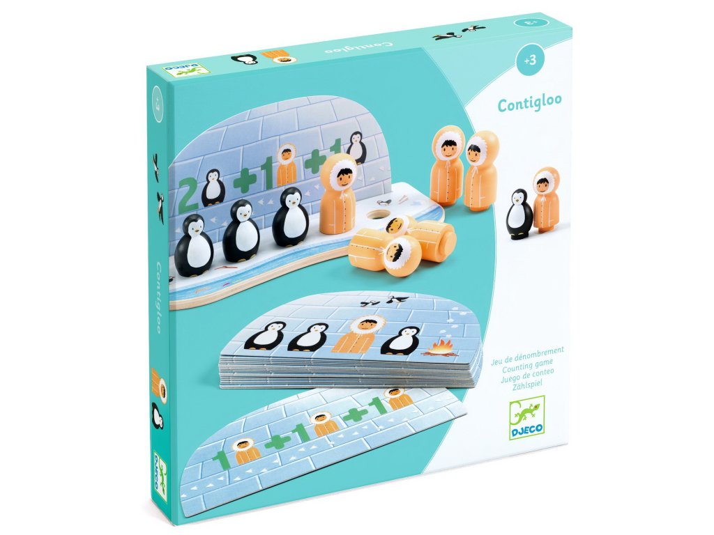 Contigloo je dokonale propracovaná zábavná hra pro děti, ve které je praktikováno učení hrou a zábavně. Děti se naučí první počty a čísla. Podle kartičky se zadáním umístí postupně figurky na hrací desku.